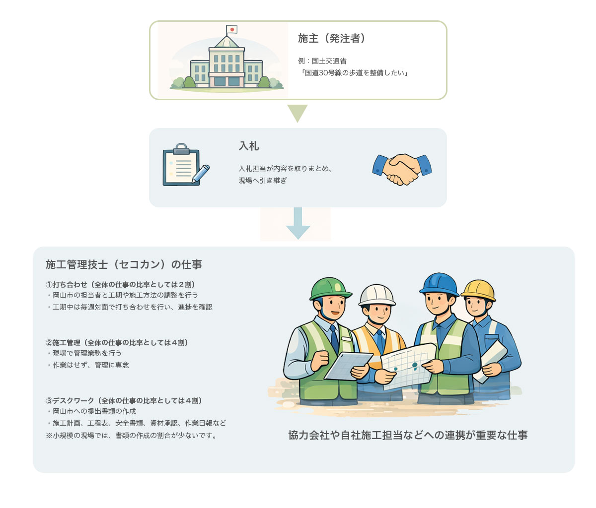 施主様、職人さん、設計担当者など、様々な立場の方をつなぐ調整役となります。